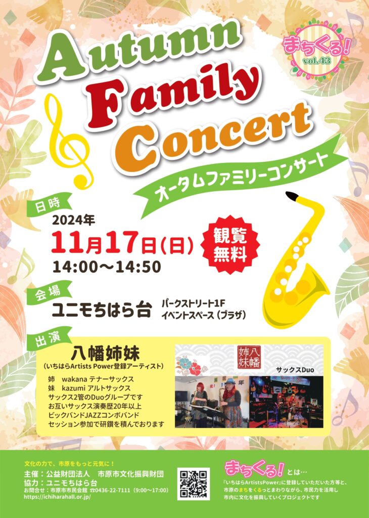 まちくる!vol.43 suetake 1年前 まちくる! vol.43 『いちはらArtists Power』× 八幡姉妹(サックス) まちくる! vol.43Autumn Family Concertが終了いたしました。たくさんの方にご来場いただき、ありがとうございました。 八幡姉妹 紹介ページはこちら *2024年11月17日(土)ユニモちはら台公演* まちくる! 公演実績一覧へ