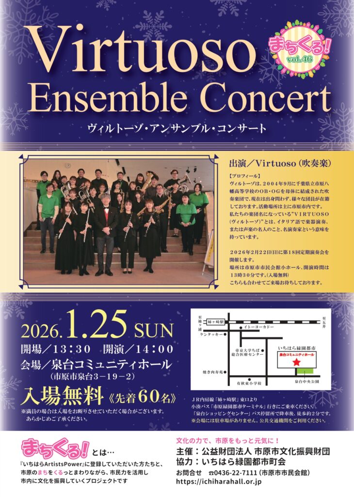 まちくる!vol.46 suetake 2日前 まちくる! vol.46 『いちはらArtists Power』× Virtuoso(吹奏楽) まちくる! vol.46Virtuoso Ensemble Concertを開催いたします。たくさんの方のご来場をお待ちしております。 Virtuoso 紹介ページはこちら まちくる! 公演実績一覧へ